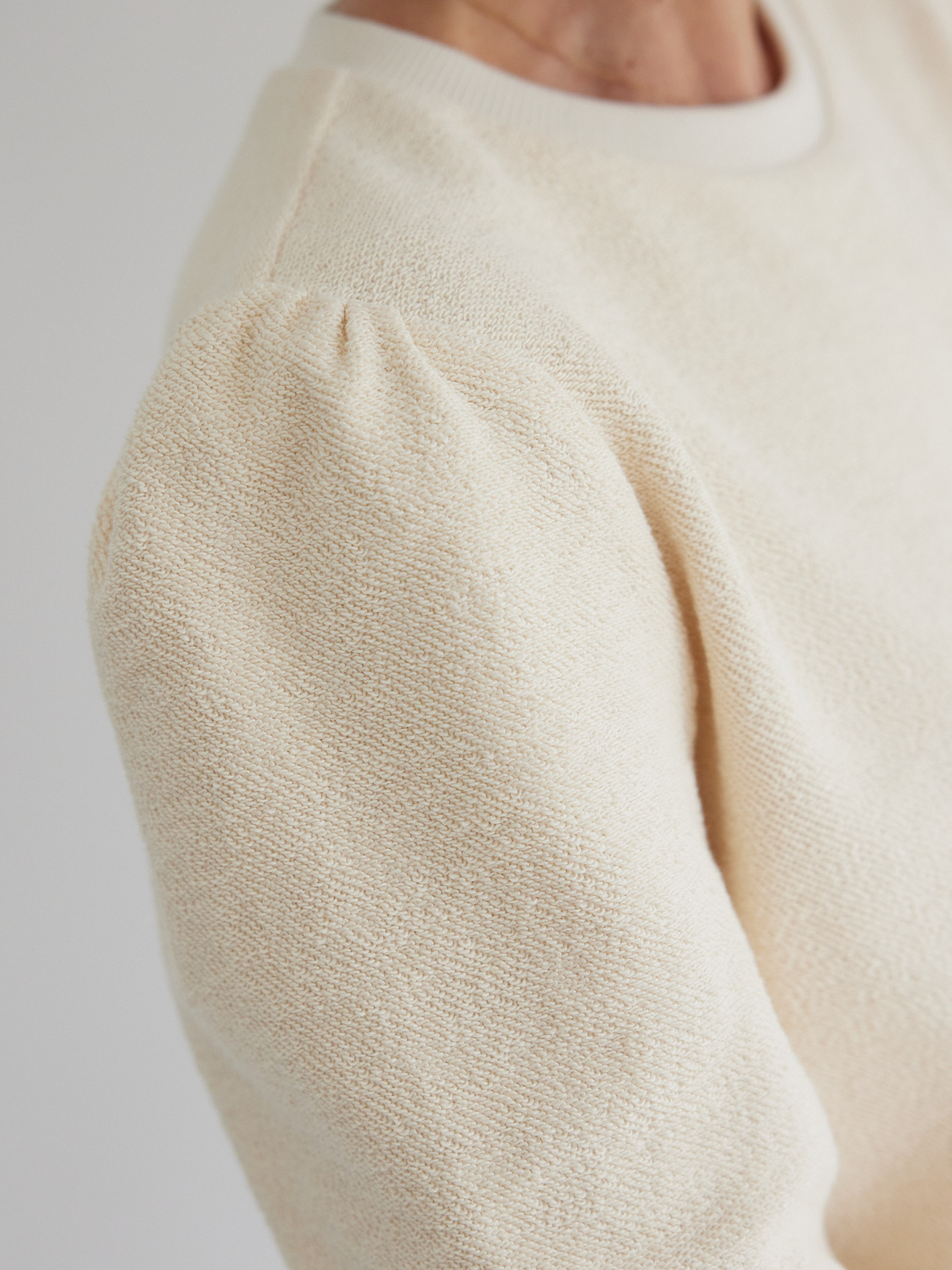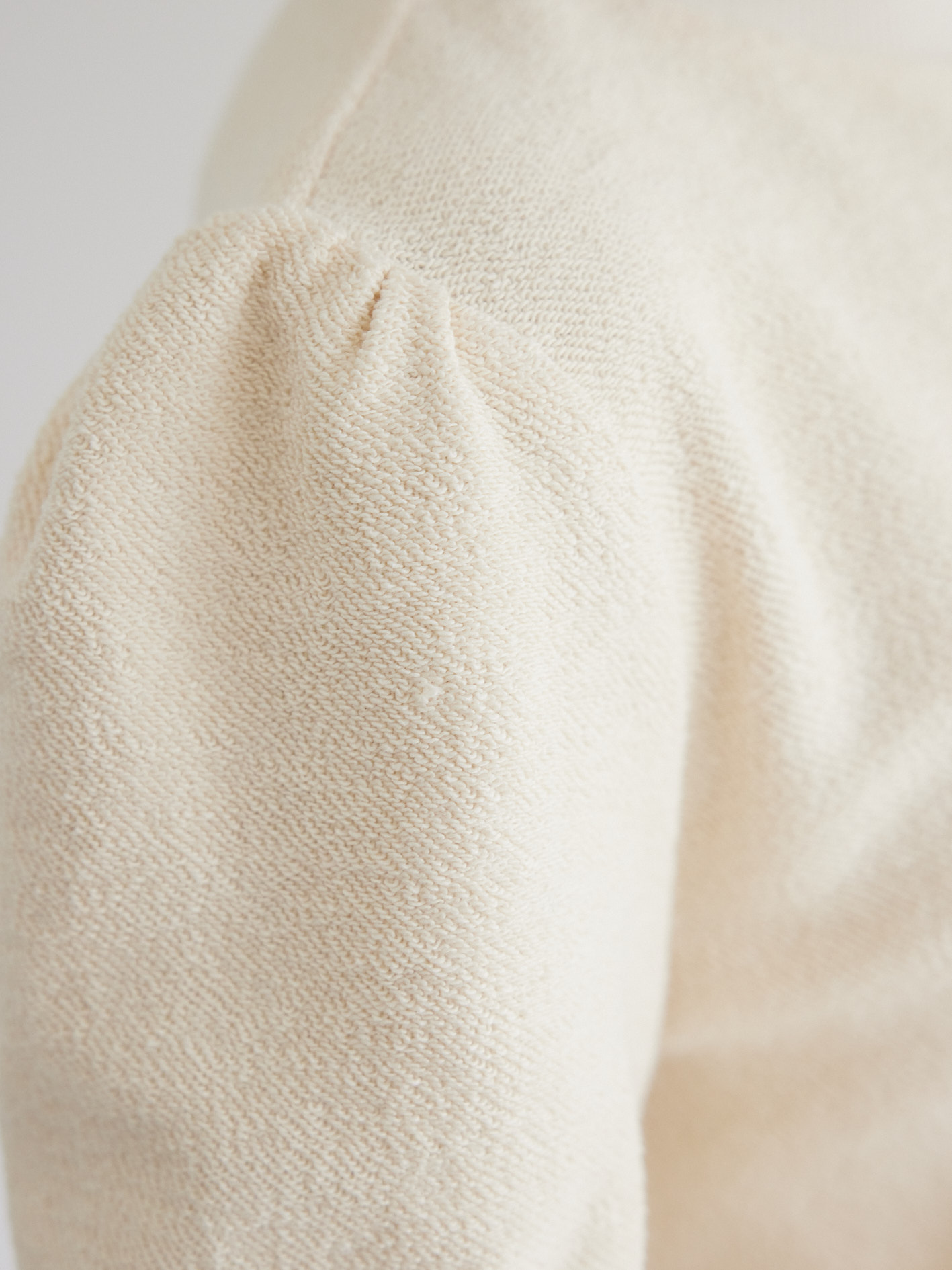 Matière du tissu : molleton écru avec un envers bouclette, 100% coton bio, bord-côtes côtelé écru 95% coton/5% élasthanne