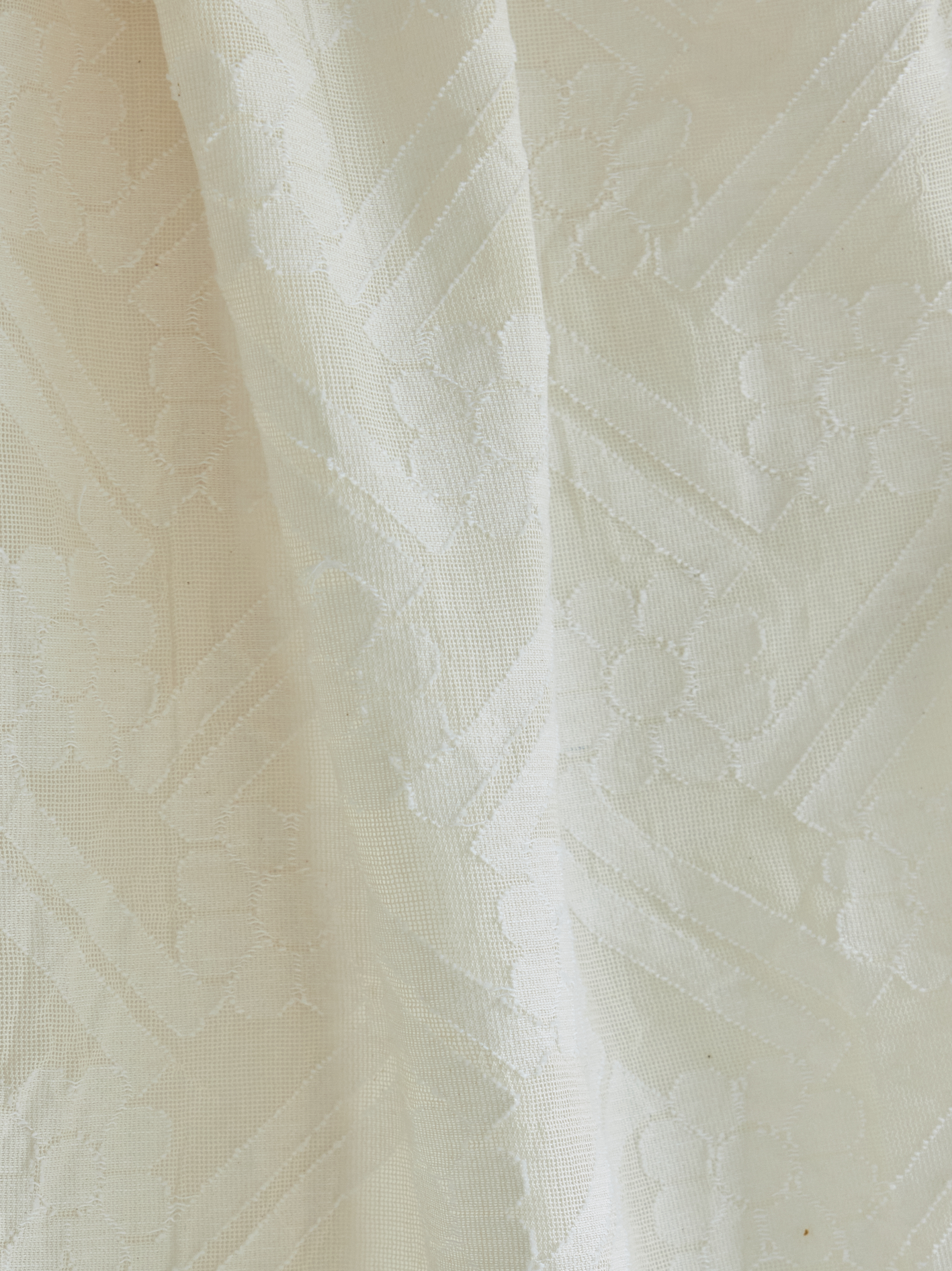 Matière du tissu : magnifique jacquard de coton écru, 100% coton. Le tissu se gaufre et s’assouplit au 1er lavage, le rendu définitif après le lavage est celui des photos, à réception du tissu, le jacquard a peu de relief.