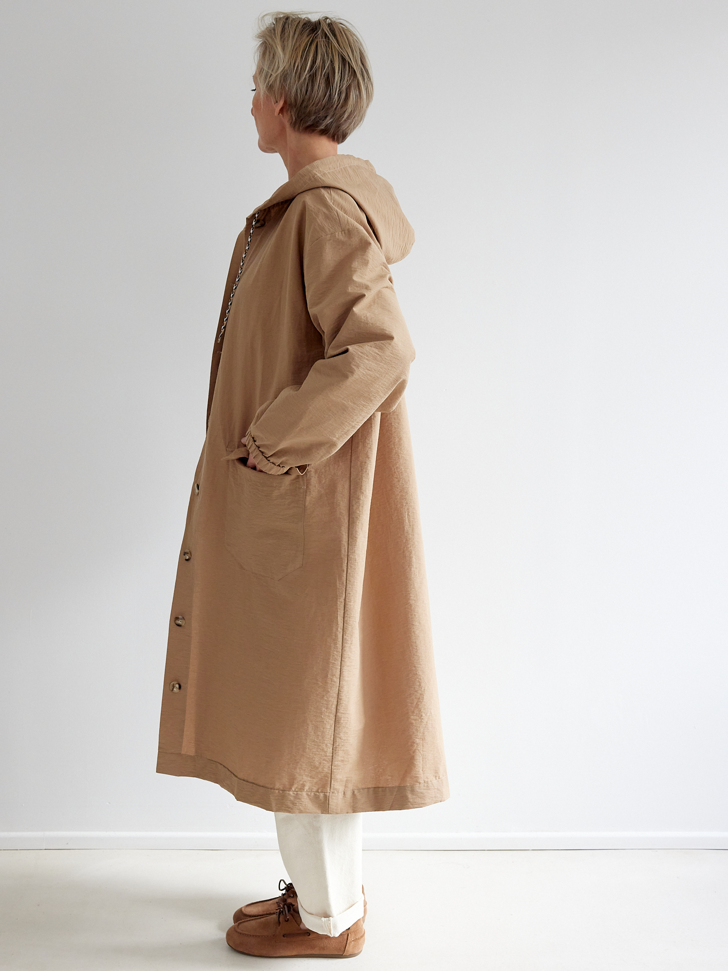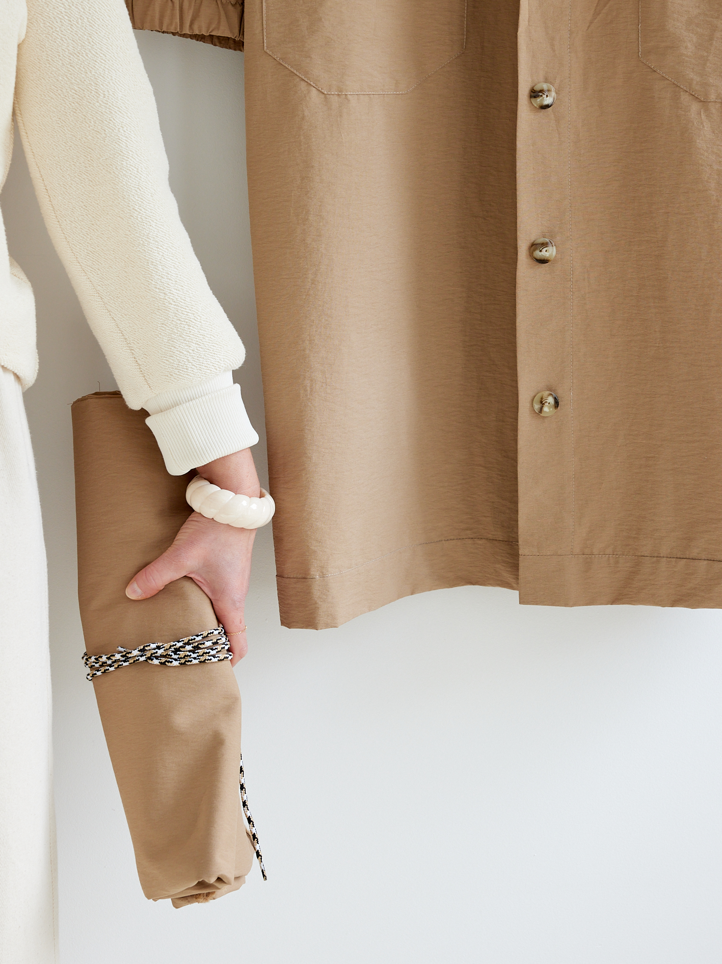 Matière du tissu : belle toile parachute camel à l’aspect légèrement gaufré, légère et coupe-vent, résistante aux déchirures et séchant rapidement. 86% coton/14% polyamide.