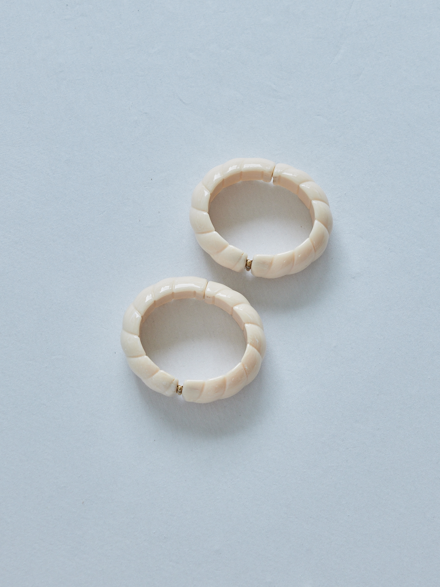 Magnifique bracelet jonc torsadé en résine recyclée écrue se fermant avec un aimant. Les formes arrondies et la matière du bracelet lui donnent beaucoup de caractère et viendront accessoiriser tout simplement les looks de printemps.