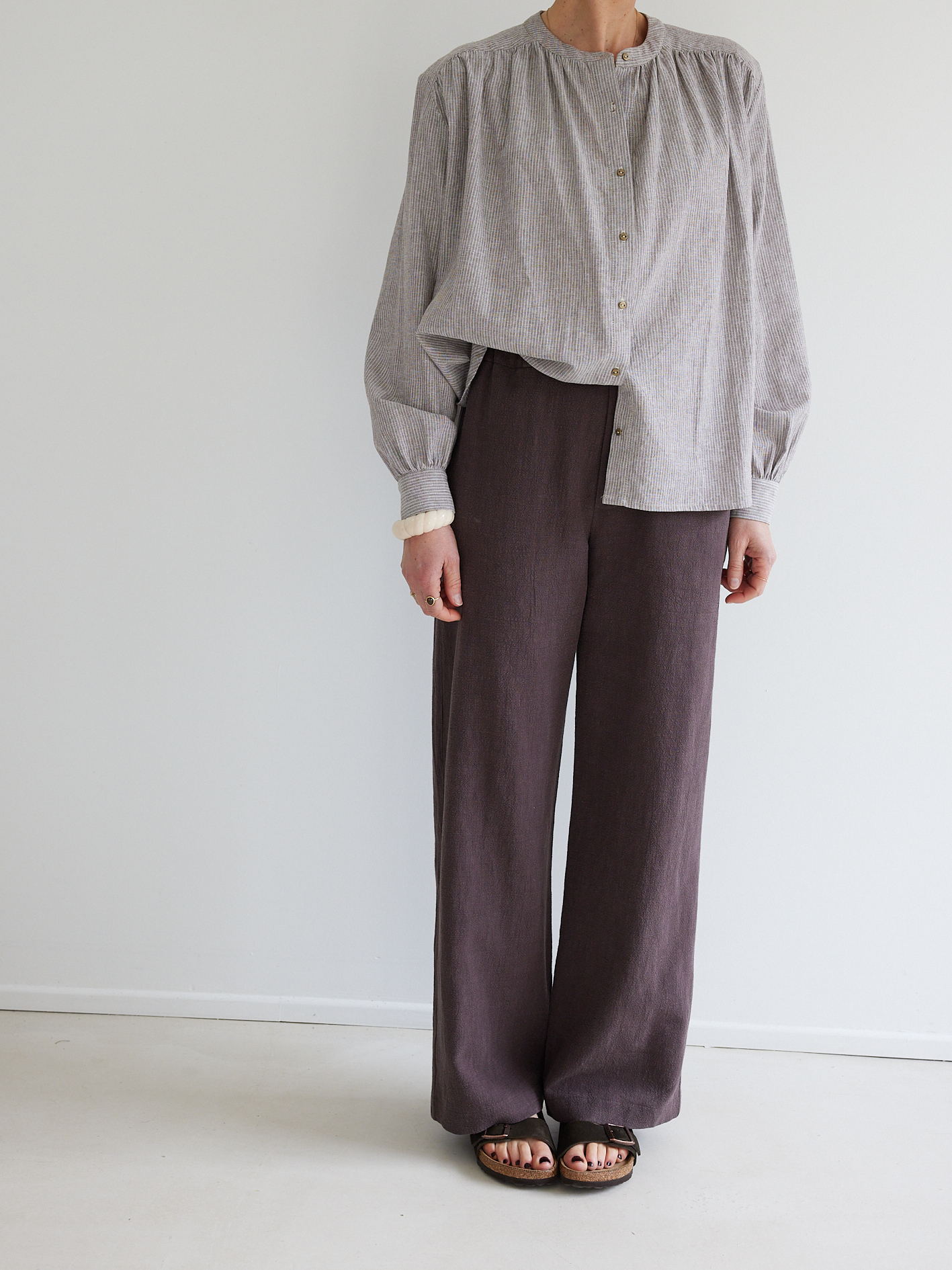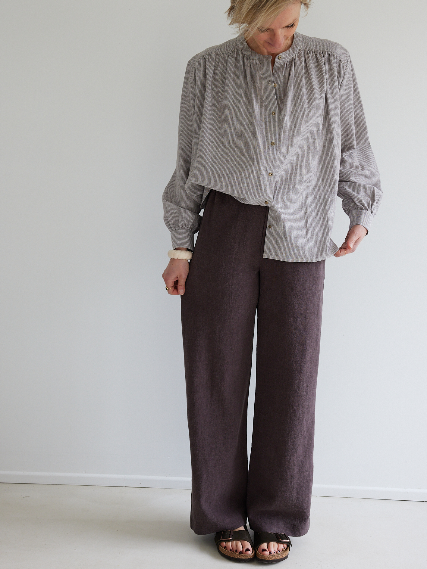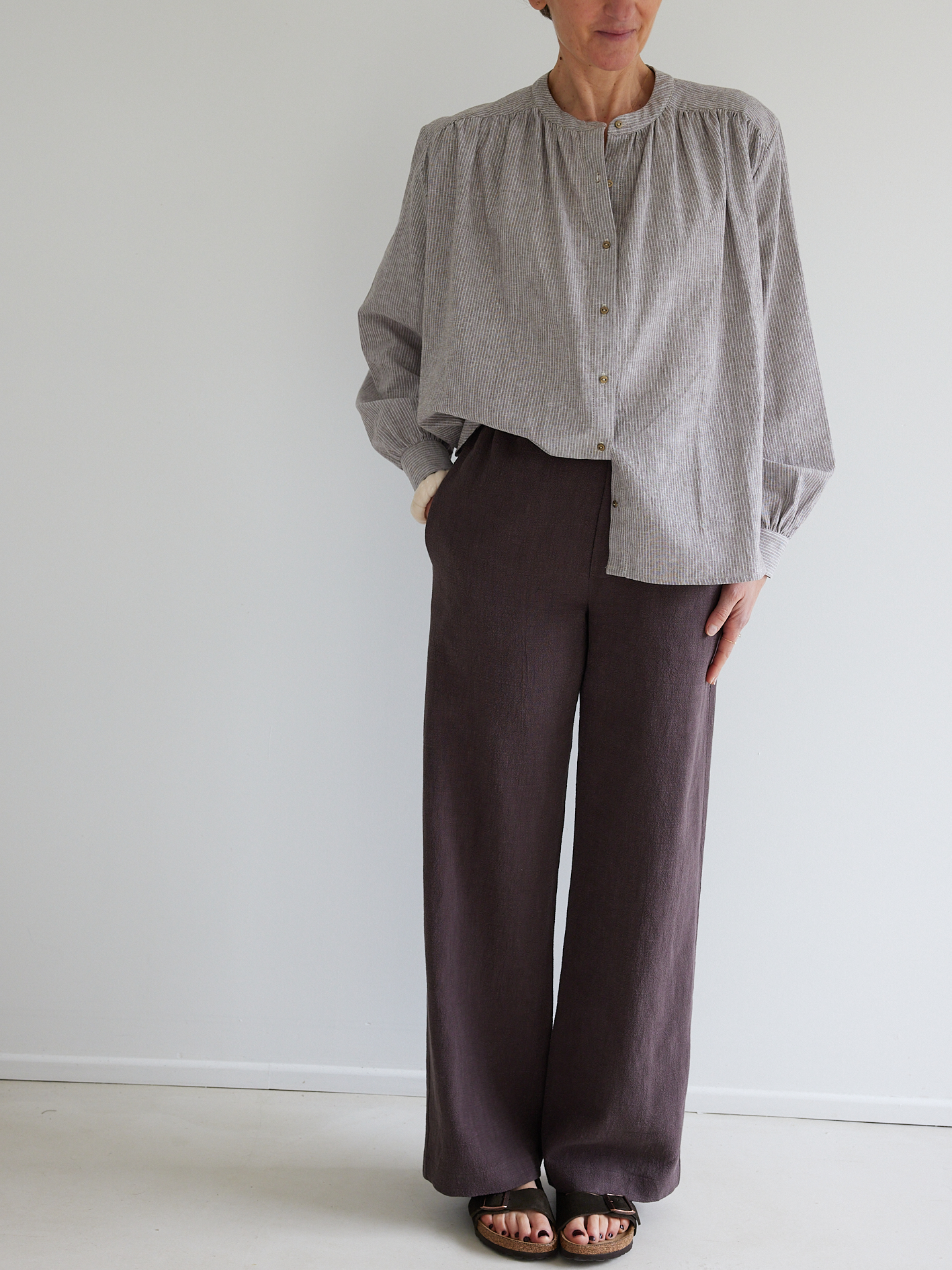 KIT À COUDRE – La blouse Allure en lin/coton fines rayures moka