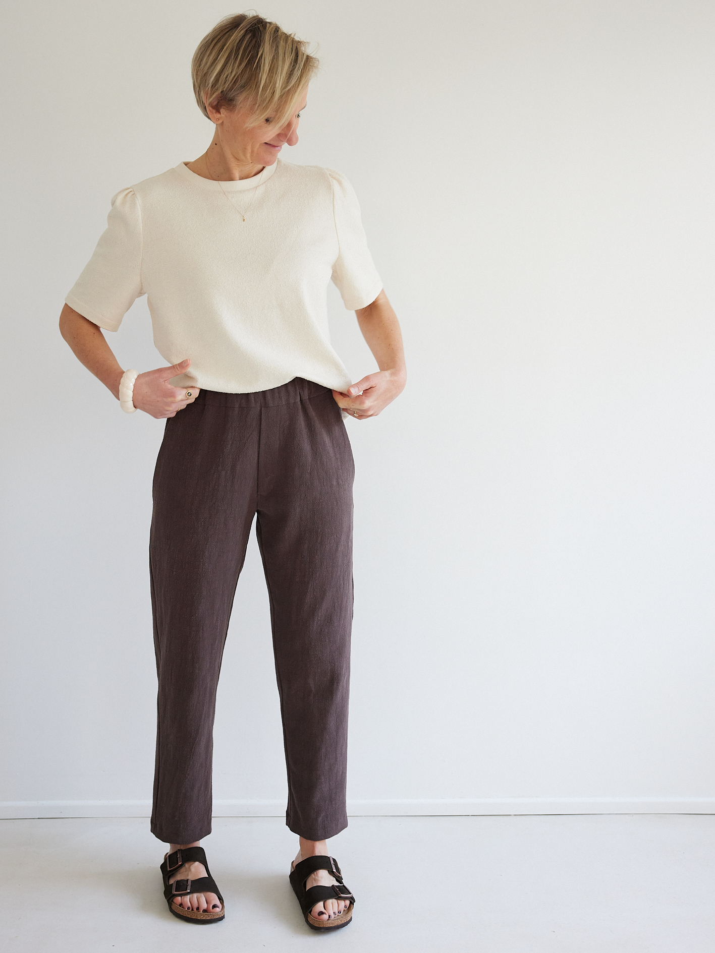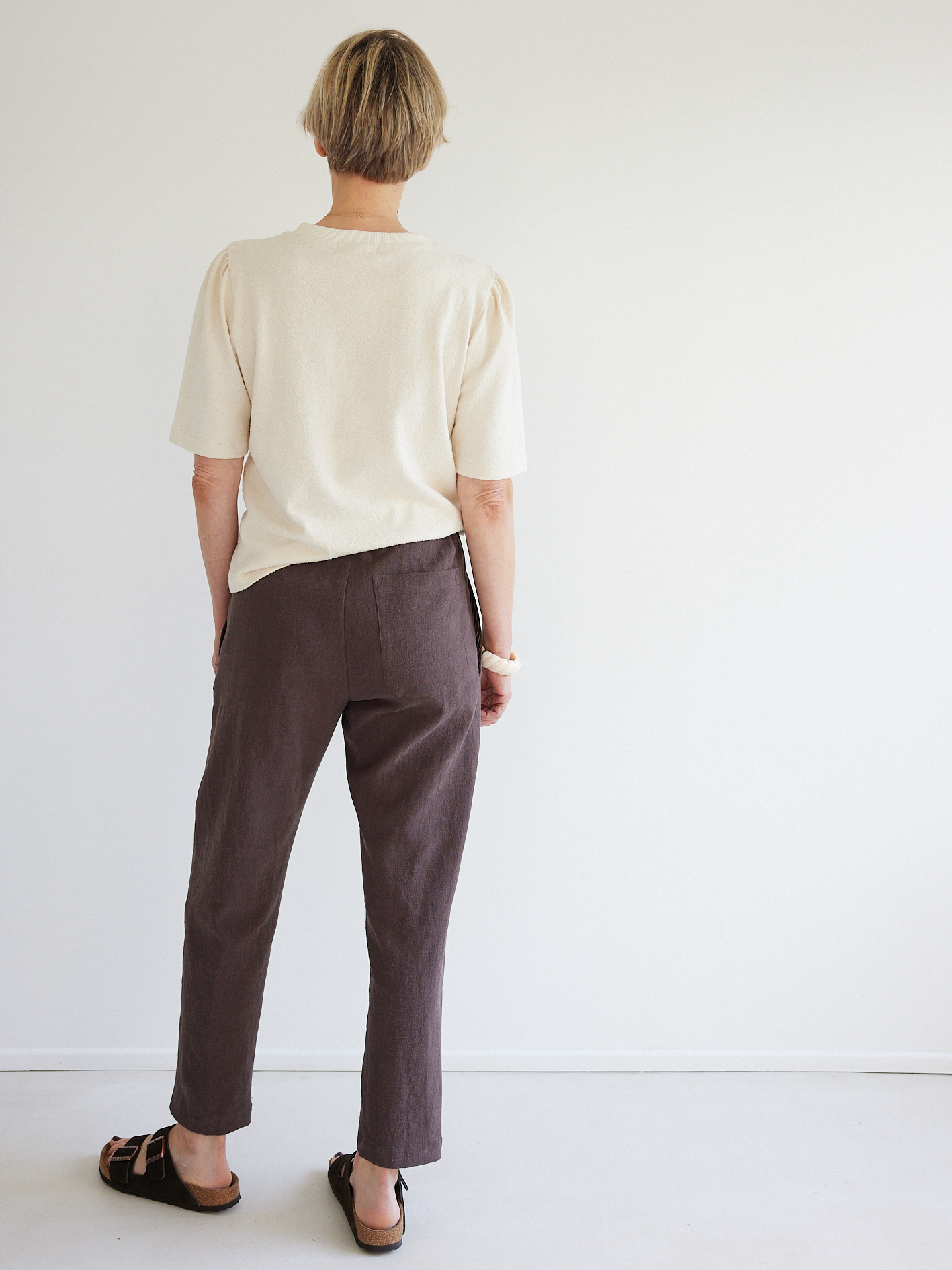 Un pantalon coupe mom facile à coudre en lin lavé cacao