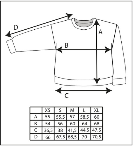 Choisissez votre taille en vous référant au tableau de mensurations en bas de page et trouvez la taille idéale en consultant notre guide des tailles. Le sweat Parfait ne taille pas grand, nous vous conseillons de surtailler d’une taille pour un coté plus oversize Valérie (1,65m / 86-72-90) porte la taille M.