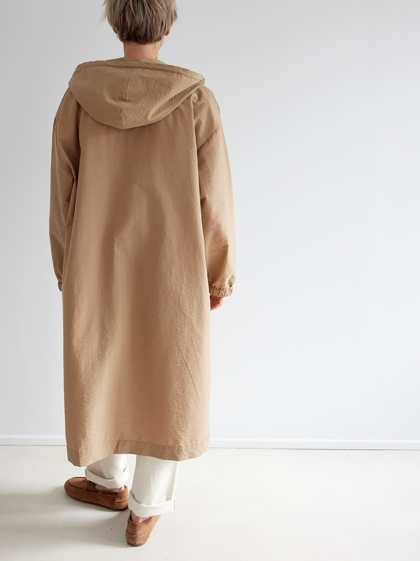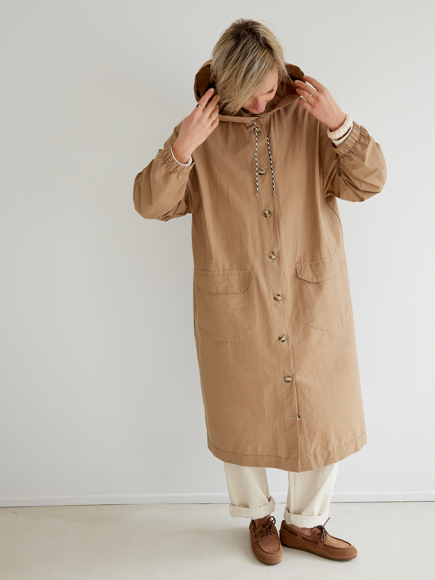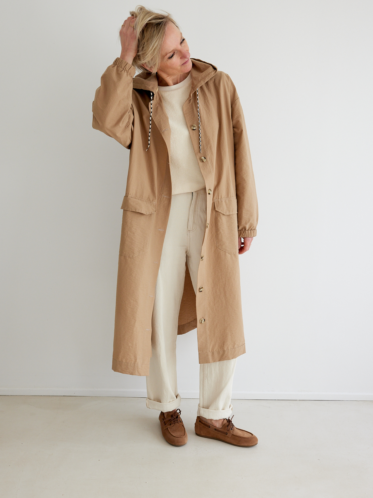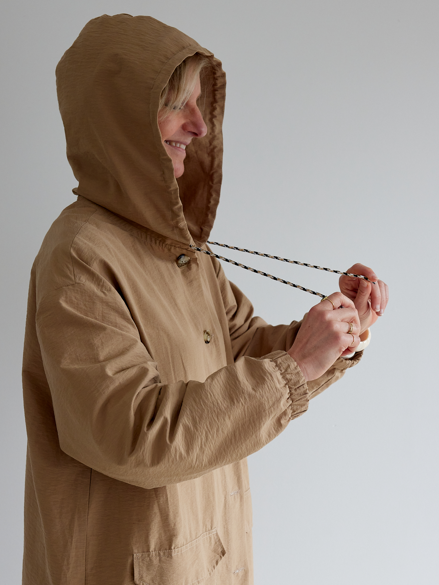Matière : belle toile parachute camel à l’aspect légèrement gaufré, légère et coupe-vent, résistante aux déchirures et séchant rapidement. 86% coton/14% polyamide.