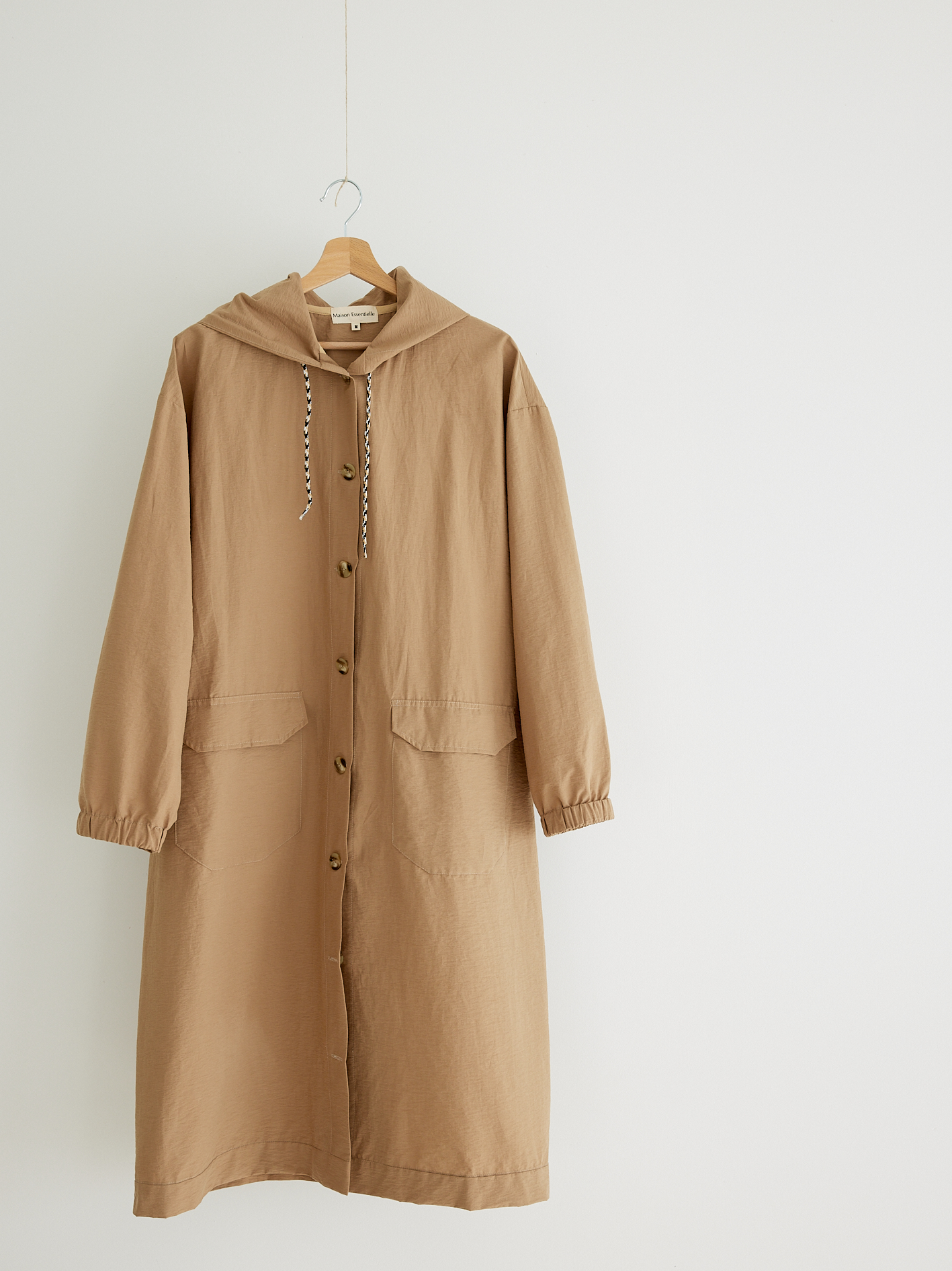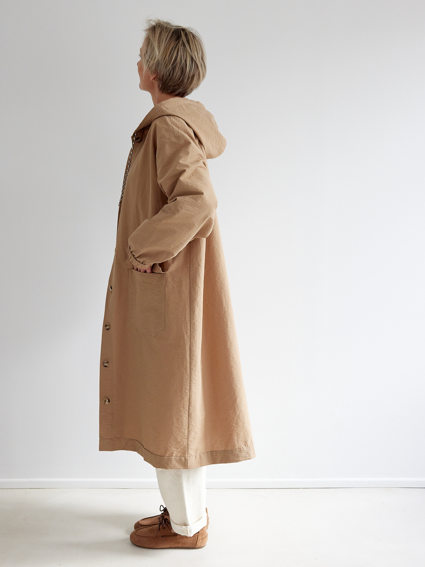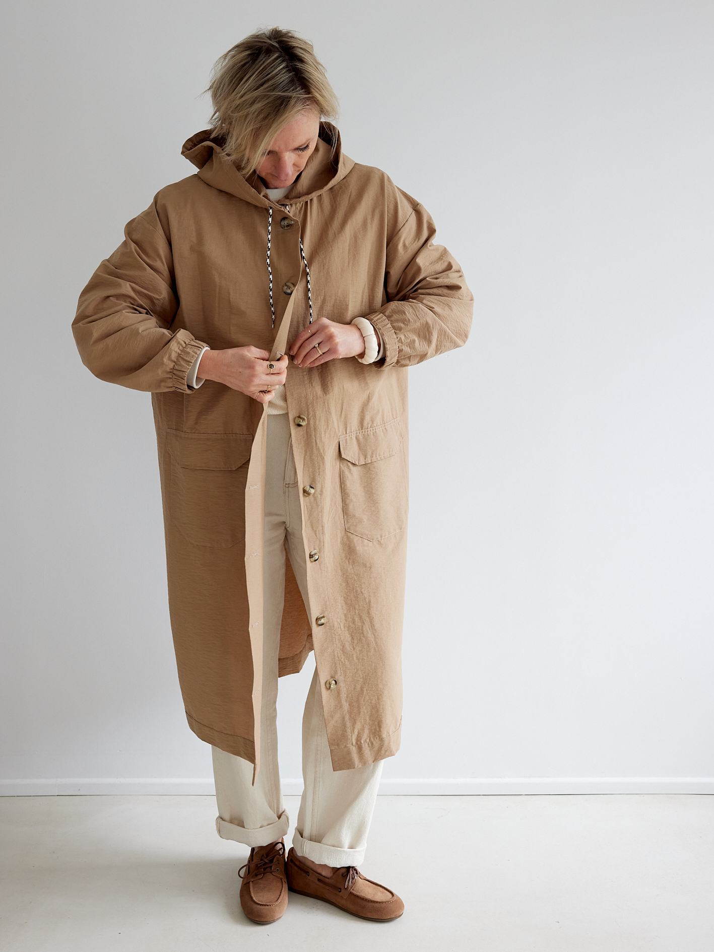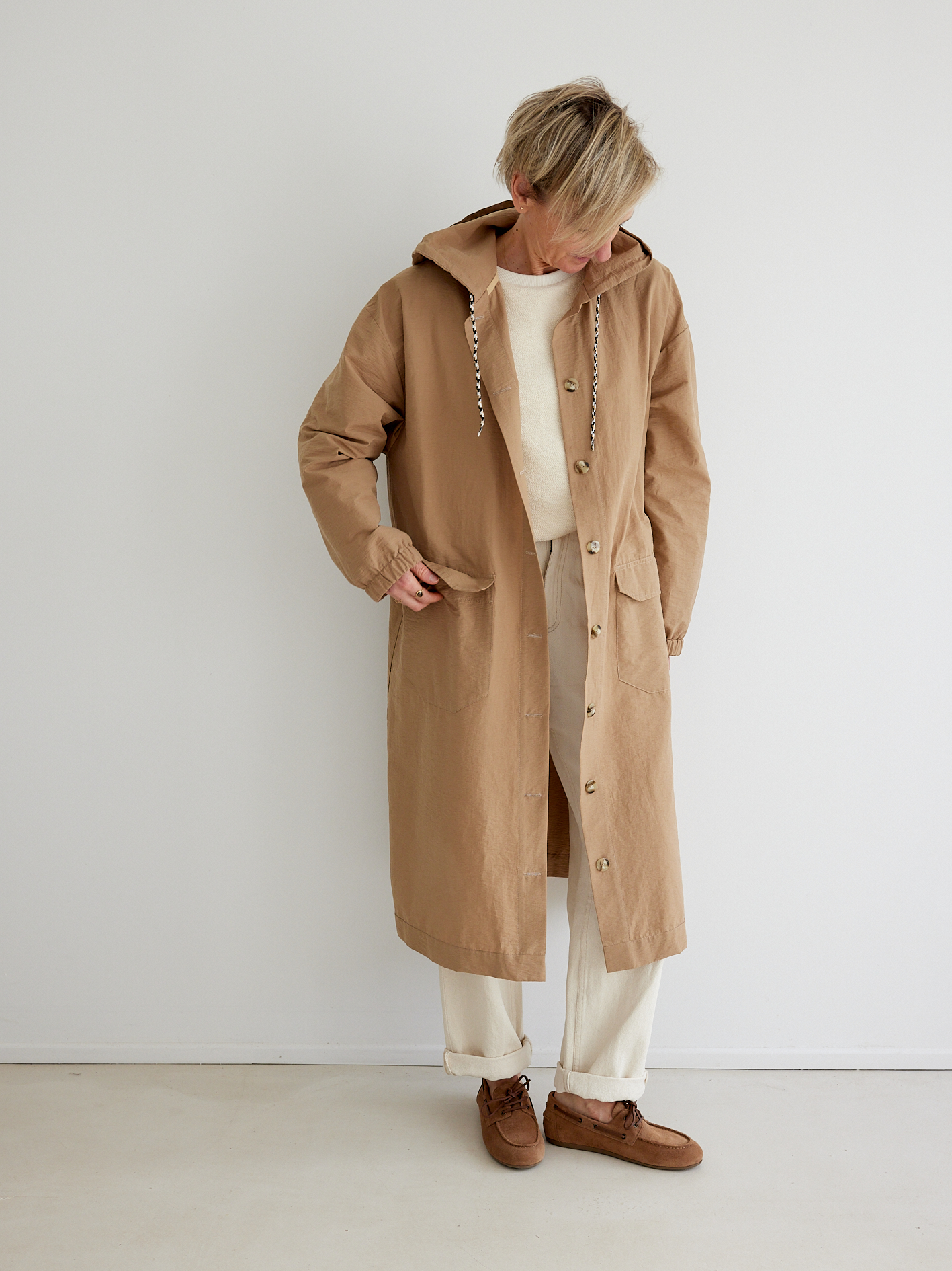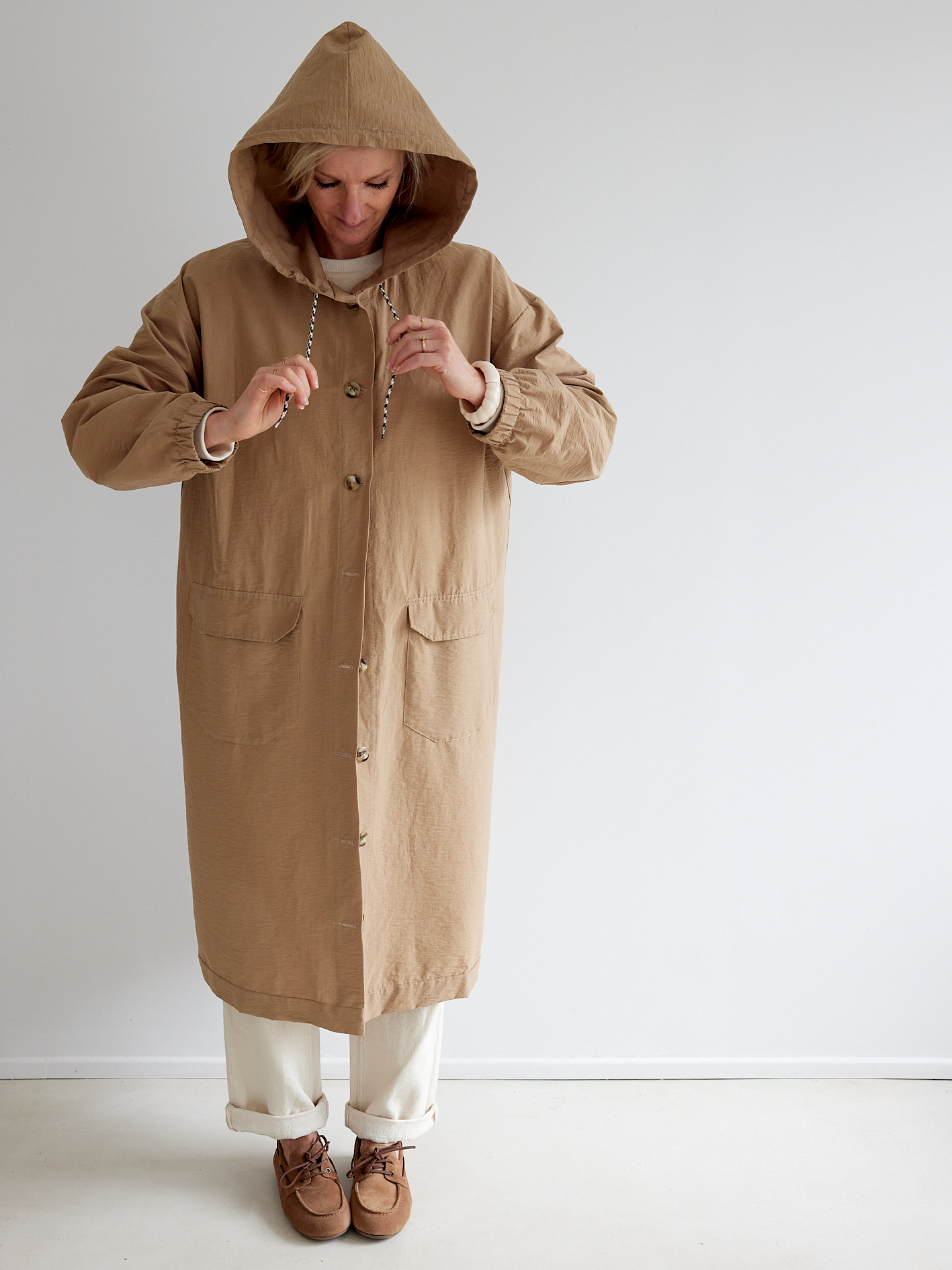 Matière : belle toile parachute camel à l’aspect légèrement gaufré, légère et coupe-vent, résistante aux déchirures et séchant rapidement. 86% coton/14% polyamide.