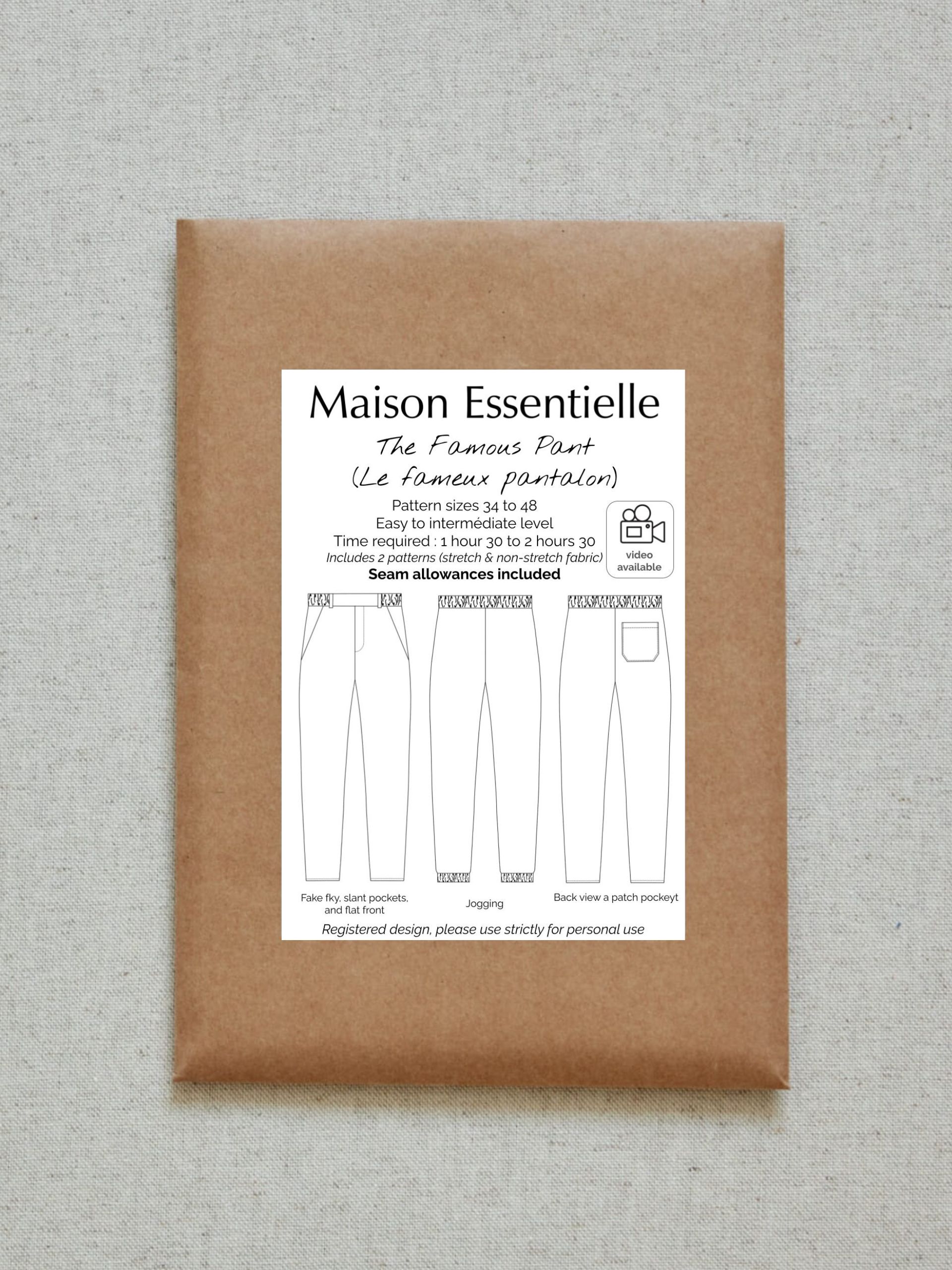 Le Fameux est un patron de couture niveau débutant à intermédiaire pour coudre très facilement un pantalon. Le Fameux pantalon est un bon basique à la coupe intemporelle et confortable. Sans pince, ni fermeture et avec une taille élastique, il est facile à coudre. Le patron est composé de deux planches pour réaliser une version stretch et une version non stretch.